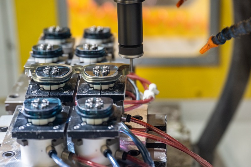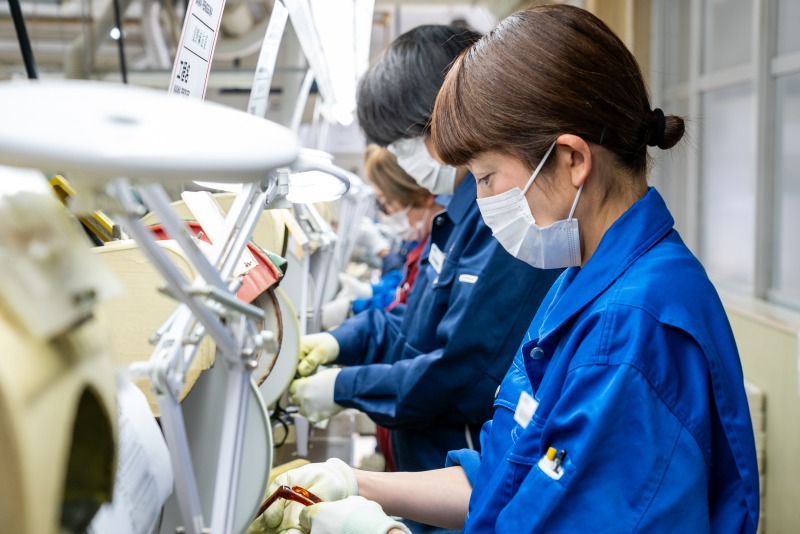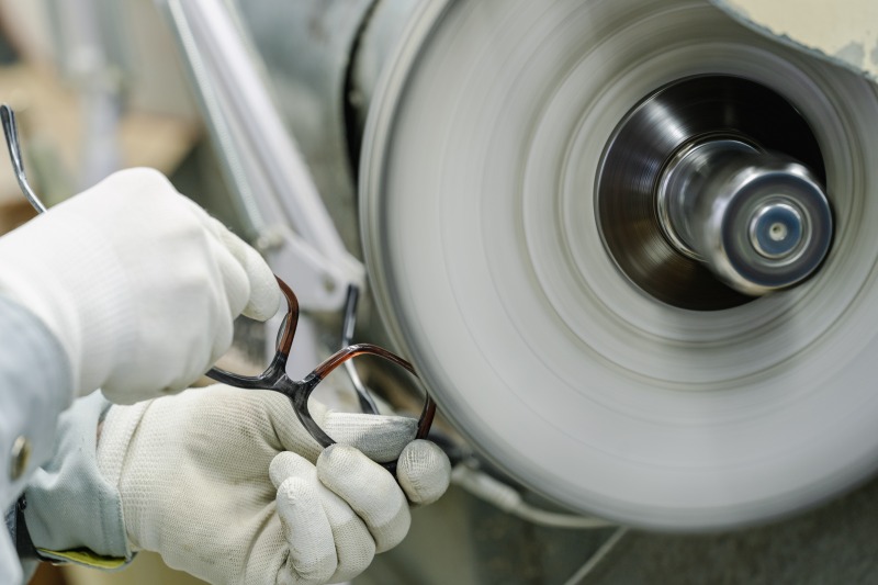 No matter how advanced the technologies and machinery that we use, ultimately it is the craftsmanship, insight, and sensitivity grounded in the experience of each employee that operates the machinery and produces our frames. Our employees can be described as quality resources. The production of eyeglass frames involves a wide range of processes, including attaching nose pads to the frames and the polishing details that cannot be polished in barrel polishers. The finishing process includes placing lenses inside the frames, adjusting them, and then a strict final inspection to detect tiny scratches or other defects.
